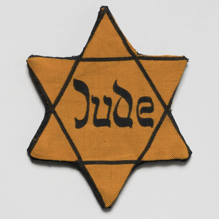 Until the Holocaust, the six-pointed star had only positive connotations in Jewish tradition. It was used as a symbol of communal identity, a protective device in amulets, or a Zionist emblem. After the German occupation of Poland in 1939, the Nazis forced Jews to wear a yellow star as an identifying badge, often inscribed with the word “Jew.” The lettering, seen here in German and French versions, was meant to resemble Hebrew. This measure deliberately turned a symbol of Jewish pride into an emblem of discrimination that singled out Jews, restricted their movements, and marked them as prey. Concealing the badge was an offense punishable by deportation to a concentration camp.