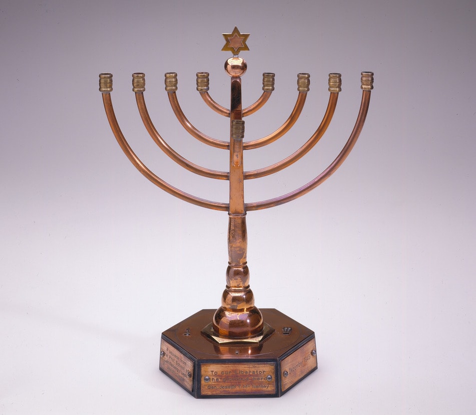 The Hebrew inscription on the lamp, "A great miracle happened there," is found on the tops or dreidls that children play with on Hanukkah in Ashkenazi communities. It refers to the miracle of Hanukkah, but may in this instance also poignantly signify the liberation and salvation of the Jews in the DP camp.