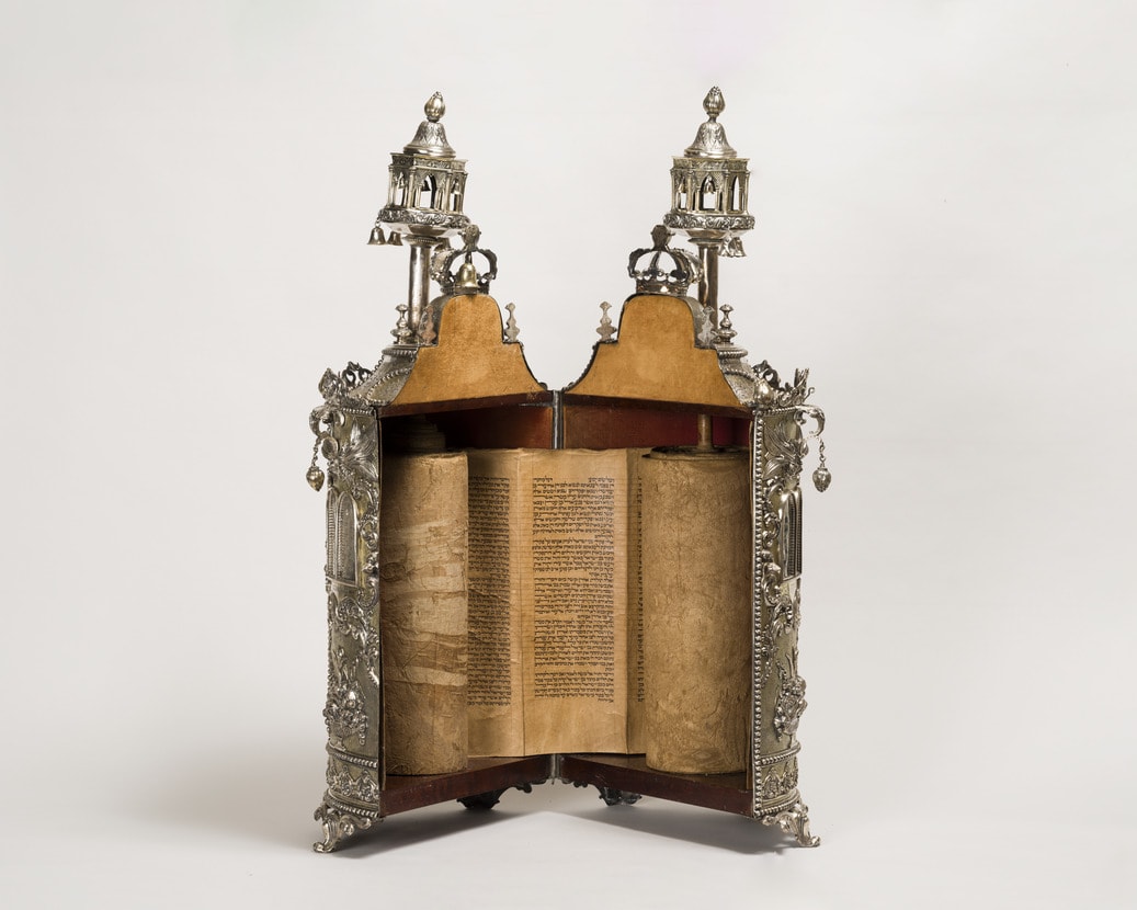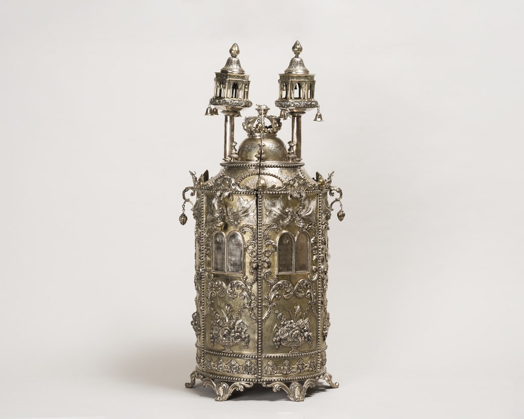 This Torah case was made by the Parisian Jew Maurice Mayer, who used the title “goldsmith to the Emperor”—that is, Napoleon III. His case combines the ornate decorative style of the French Second Empire with the type of hard housing for the Torah more commonly found in Italy, the Mideast, and North Africa. It bears a dedication to the memory of Hannah of the house of Shemama, a wealthy and influential family from Tunisia. One member, Nissim, was treasurer to the Bey, the Ottoman ruler.