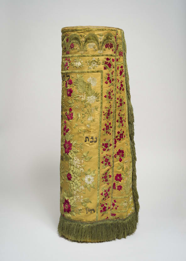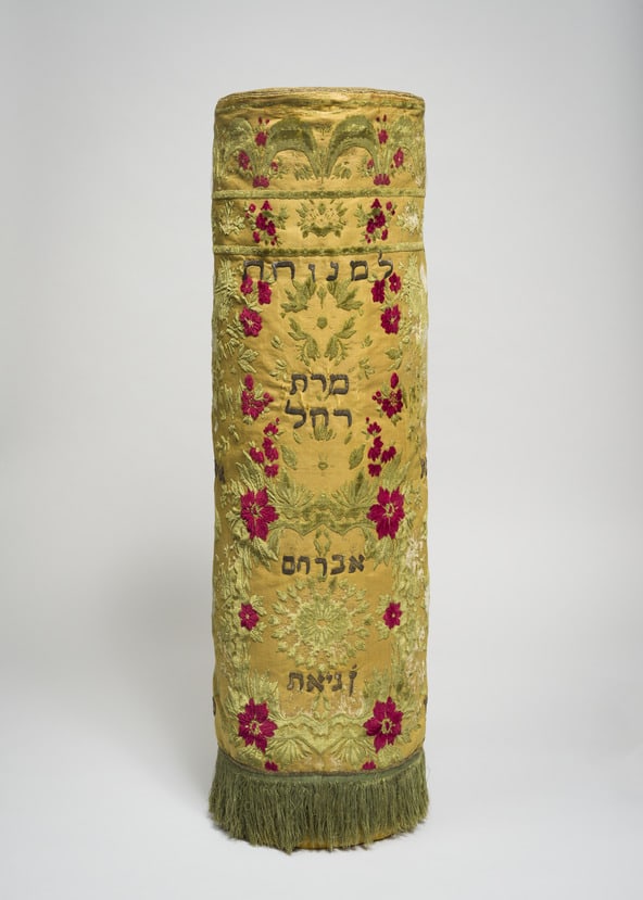 This Torah mantle is dedicated to the memory of Hadji’s mother. Her gravesite appears in the family photograph on the wall behind you, to your right. The inscription reads, “For the repose of Mrs. Rachele, may her soul rest in the Garden, the wife of Avraham Benguiat, a pure Sephardi.”