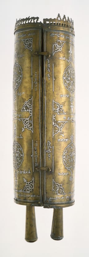 In antiquity, cloth mantles or bags (tikim) were used to protect the Torah scroll, the most sacred object in Judaism. By the eleventh century, rigid cases, also called tikim, were made from wood, copper, and silver, according to an inventory of 1059 from the Jerusalemite Synagogue that was found in the Cairo Genizah, a repository for old and worn Hebrew texts dated from the eighth to the thirteenth century. This case belongs to the earliest group of Torah cases to have survived; all five were made for the Samaritan community in the Near East during the sixteenth century. Three are still in use in the community today, while the fourth is at the University of Michigan.