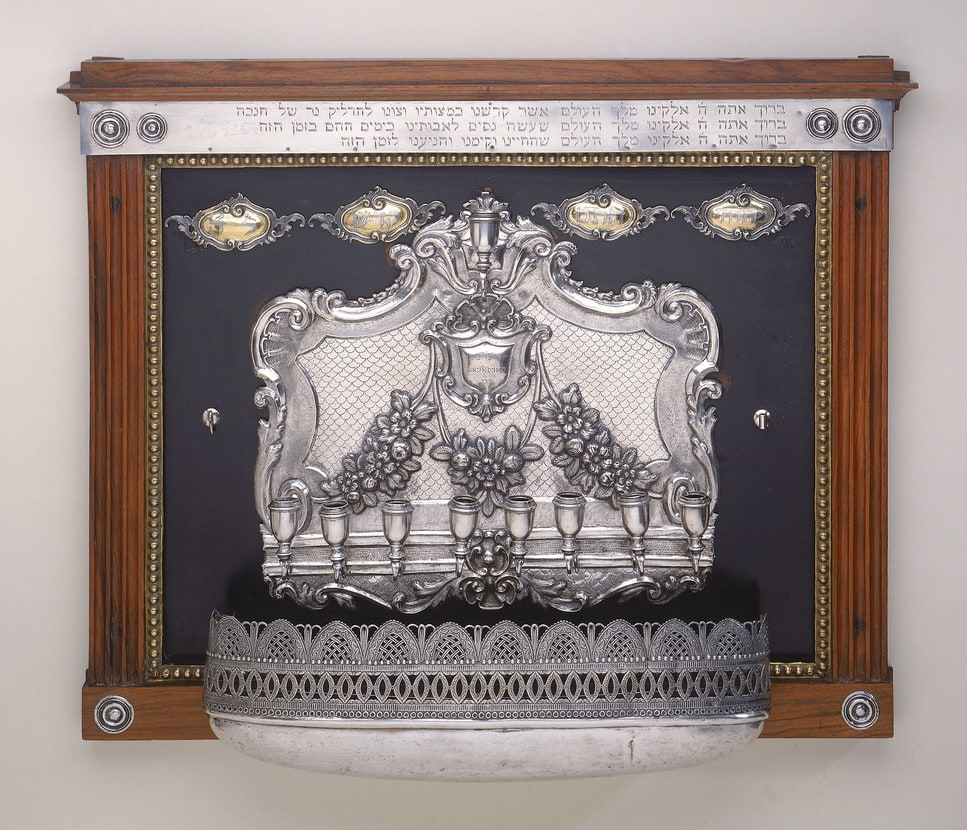 The backplate is stamped with the maker's initials, but no city mark. It is likely that it was made in Florence, since there is a Florence mark on the later drip pan. Made in rococo style, with its C-scrolls, rocaille elements, and flowers, the lamp itself could date from around 1750 to 1770. However, the absence of a city mark suggests that it was made after 1781, when it was decreed that objects with a silver content below required standards could not receive the mint mark. Such conservatism in decorative style is common in Italian Judaica, where the rococo style of the 1750s was continued several decades after its heyday.