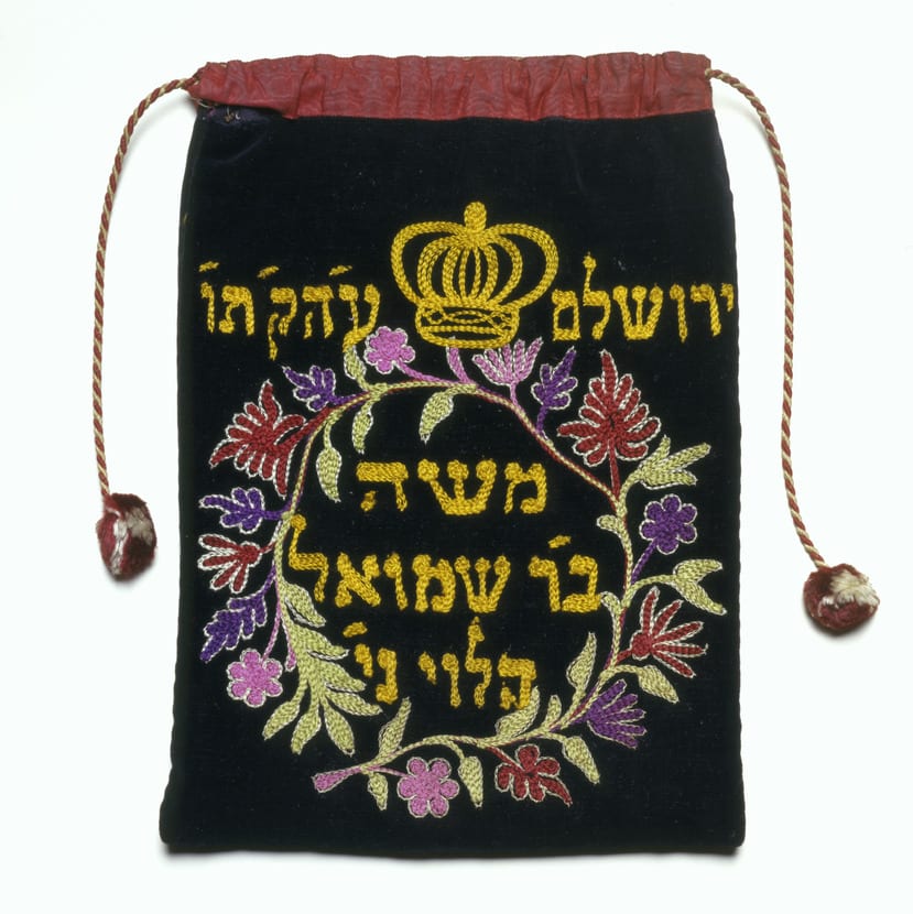 The front of this tefillin bag shows the Western Wall of the Temple Mount together with the Temple and Midrash Shlomo (The School of Solomon).