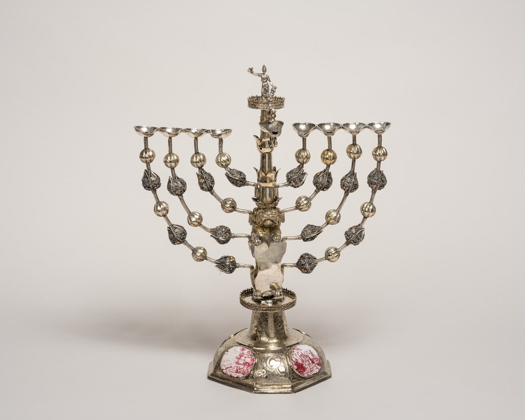 A new type of Hanukkah lamp for home use, in addition to the bench type seems to have been developed in Frankfurt in the late seventeenth century-one with a central shaft and curved arms in the form of the ancient menorah. The earliest lamps in this new domestic size were produced by Frankfurt silversmiths Johann Valentin Shüler (1650-1720) and his brother Johann Michael (1658-1718). The two lamps of this type in the museum's collection were made by Johann Michael's brother in law, Johann Adam BoIler. The lamps all have tubular arms ornamented with alternating flowers and knobs or bell shaped forms, reminiscent of the biblical description of the first seven-branch menorah crafted during the Exodus. The figure of the biblical heroine Judith is placed at top on a round platform.