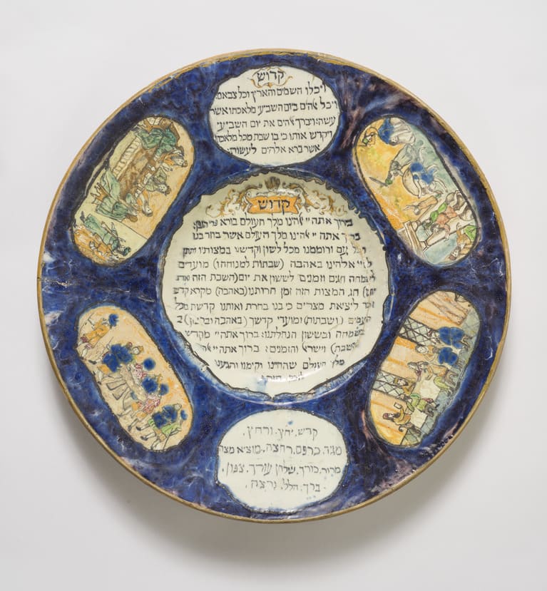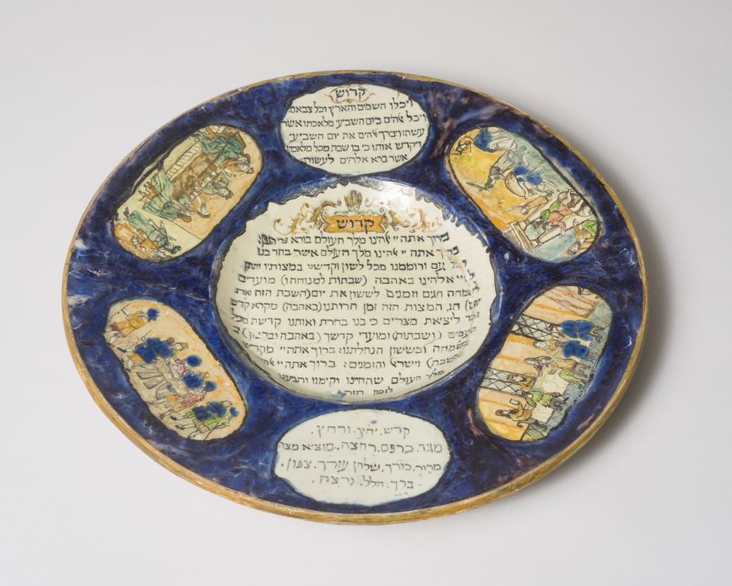When this seder plate was catalogued in 1899 by the Smithsonian Institution in Washington, DC, it was thought to have been made by Spanish Jews in the thirteenth century and glazed in Italy in the sixteenth. However it is actually one of a large number of forged Italian majolica (glazed earthenware) seder plates of similar design, made in the late nineteenth century. The Benguiats probably acquired it at that time, when they lived in Italy.