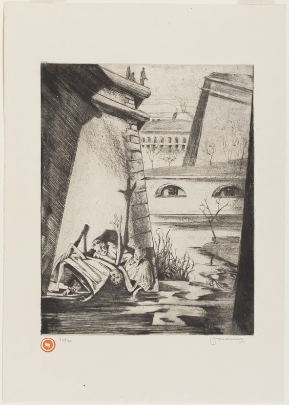 Trained at the Weimar Academy of Fine Arts, Fritz Lederer designed sets for theater productions in Theresienstadt. This engraving is part of a portfolio of prints he created after the war, depicting oppressive scenes of the camp, including the infamous Small Fortress, the prison where many inmates were tortured and killed.