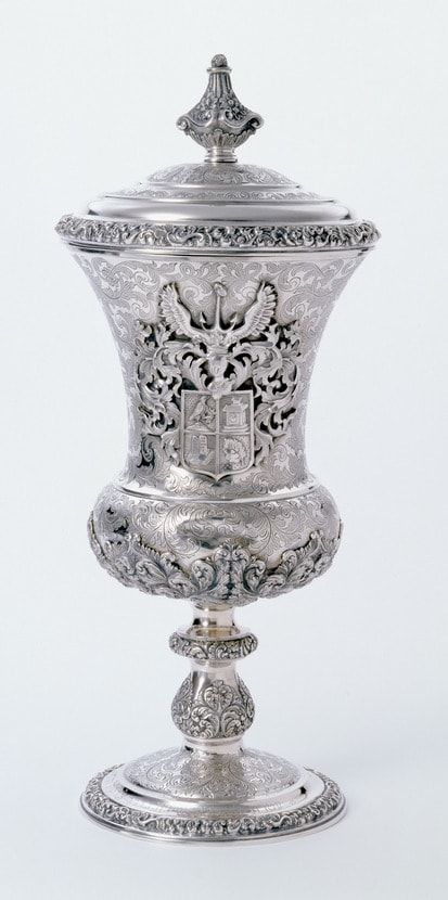 This cup was presented to Isaac Loew Hofmann by the Jewish community of Vienna on the occasion of his golden wedding anniversary. Hofmann was a leader of the community and an important financier who developed the silk and potash industries in Austria.