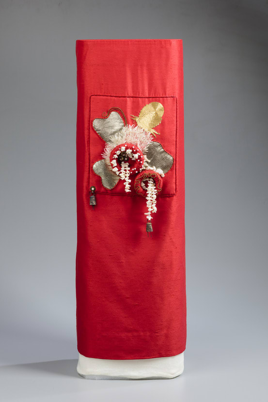 - Silk: appliqued with metallic threads, fish scales, mother-of-pearl, pearls, leather, brass wire and bronze