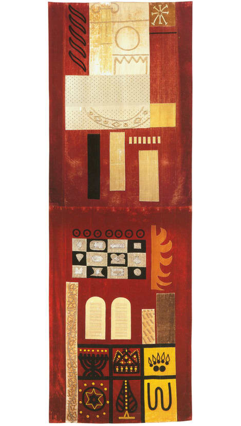 In a bold step, Percival Goodman, architect for the Millburn synagogue, charged three emerging, avant-garde artists with commissions to decorate that building. Adolph Gottlieb, Robert Motherwell, and Herbert Ferber, each of whom has since become a major figure in the Abstract Expressionist movement, supplied a Torah curtain, a lobby mural, and an exterior sculptural relief, respectively. Gottlieb's design for the curtain (actually executed by the women of the congregation under the supervision of his wife, Esther) is a late example in the development of his influential pictograph paintings of 1941-53. It directly reflects these compartmentalized canvases, which in turn were influenced by the grid-based works of Mondrian and by the sectional arrangement of religious narrative cycles of the early Italian Renaissance.