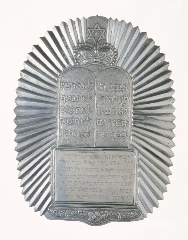 This dedication plaque, called a Shaddai is unique to the Greek Jewish Community. It would have hung in the synagogue, possibly on the Torah ark curtain. The plaque was donated in 1919 by congregants in Ioannina, Greece to a transplanted Greek synagogue in New York City along with a Torah scroll, Torah ark curtain and finials.