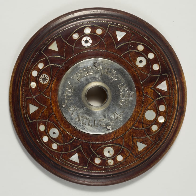 - Wood: inlaid with mother-of-pearl; silver (?): chased
