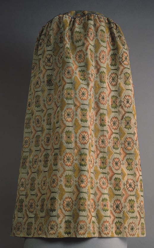 The fine quality of the needlepoint suggests an early date, close to that of the binder by Rikah Polacco (1988-21). A three-dimensional effect is achieved through the raised metallic threads at the center of each serrated quatrefoil. Abstract motifs like those on this mantle also appear on needlepoint Torah curtains, mantles, and binders in various communal collections.