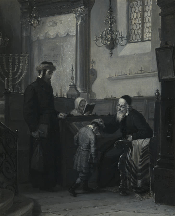 Oppenheim shows the cultural diversity of Frankfurt's Jews by depicting a man in Polish dress. After the Sabbath morning service, a devout father, wearing the long coat and fur-trimmed hat (streimel) of Polish Jews, asks the venerable rabbi to bless his child. The kindhearted rabbi is believed to be Tobias Sondheimer, and the figures are though to be his son and grandson. Sondheimer served as leader of the synagogue in Oppenheim's hometown, Hanau, from 1795 to 1830.