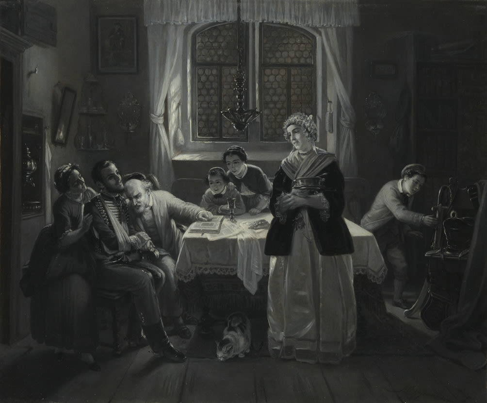 The Return of the Volunteer is Oppenheim's most overtly political painting in the cycle. It affirms the patriotism of German Jews and addresses the question of their assimilation. The work portrays a soldier who has returned home from the War of Liberation against Napoleon. In his haste to be reunited with his family, he has traveled on the Sabbath, contrary to Jewish law. His father is ambivalent seeing his son's decoration, the prestigious Iron Cross; he feels both pride at the military honor it represents and discomfort with its Christian symbolism.