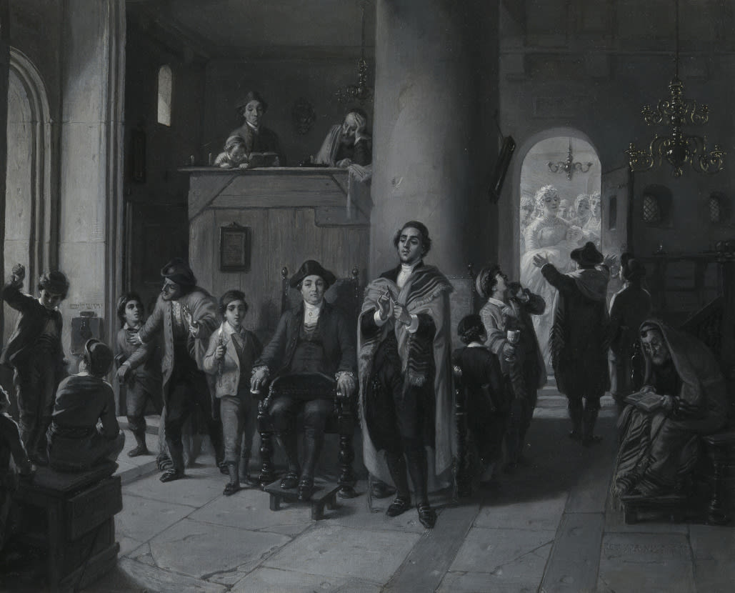 Set in the old synagogue in Frankfurt, the scene documents a circumcision, the signal rite of passage for a newborn son, in compliance with Abraham's covenant with God. The mohel who will perform the procedure stands in the center with his knife readied. Next to him on the chair of Elijah sits the godfather, waiting to receive the eight-day-old child. Nearby, a youth carries a candle symbolizing life and the future for the newborn as well as for the Jewish community. The proud father stands with outstretched arms at the doorway, where seven female figures, basking in a golden glow, present the infant. Adding a lively touch, Oppenheim includes a few mischievous boys, gently reprimanded by an elder.