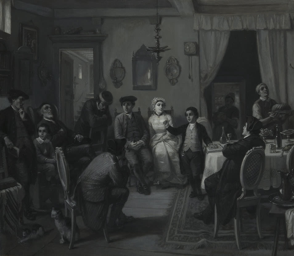 In this scene, the proud mother and the maid are the only women in a sea of men. All listen intently to the bar mitzvah boys' discourse and await the celebratory meal. A picture of Frederick the Great of Prussia (1712-86) demonstrates the family's patriotism. Again, Oppenheim adds a vernacular touch--the kitten tugs on the tassels of the prayer shawl newly acquired by the young man.