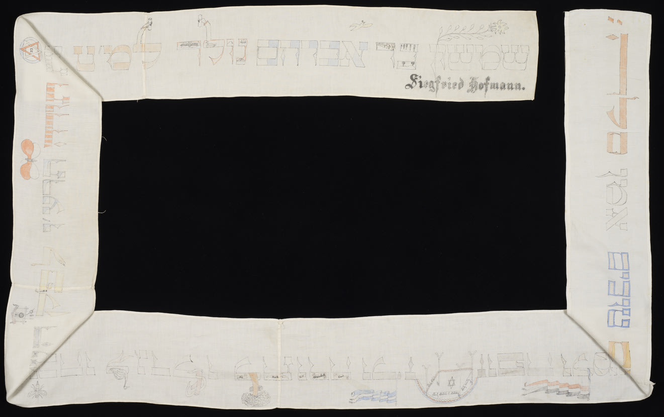 Paula Hofmann made this binder for her brother Fred Hofman (born Siegfried Hofmann) sometime after his circumcision. In May 1939 Fred, along with over nine hundred other Jews fleeing Nazi Germany, boarded the MS St. Louis and set sail from Hamburg, Germany, for Cuba. Carrying his Torah binder—one of his sole possessions—he reached Havana only to be forced back across the Atlantic. Hofman was sent to a refugee camp in the Netherlands but, through the efforts of his family, ultimately reached the United States in April 1940, serving in the US army from 1942 to 1946.