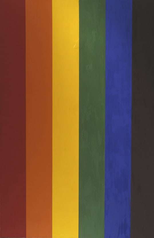Beginning in the 1980s, Bleckner began to appropriate various styles of painting, such as Op Art and the hard-edge abstraction of the 1950s and 1960s, and started to make vertical stripe paintings. While he simulated the distinctive character of serious abstract composition, Bleckner sought to reinvest such work with narrative elements. In "Double Portrait (Gay Flag)", for example, he adopts both the form and scale of abstract modernist painting, but incorporates into its ostensibly subjectless imagery the rainbow colors of the "gay flag." Moreover, while alluding to the Pop Art precedent of Jasper Johns's flag series, Bleckner introduces another symbol within his symbolic striped pattern, a Star of David-in order to herald his cultural as well as sexual identity-which he paints in three-dimensional low relief, ambiguous but discernible at the top center of the work. Similar dualistic strategies inform numerous other works, such as "Count No Count," where the artist invokes the veil of art historical reference in his use of patters of polka dots to comment on late-1960s abstraction, only to reveal in title and abstract design the additional allusion to AIDS and the critical reference to T cells. Such painting functions as a pastiche of late modernism and contemporary life-as Bleckner inflects the act of appropriation with an autobiographical twist.