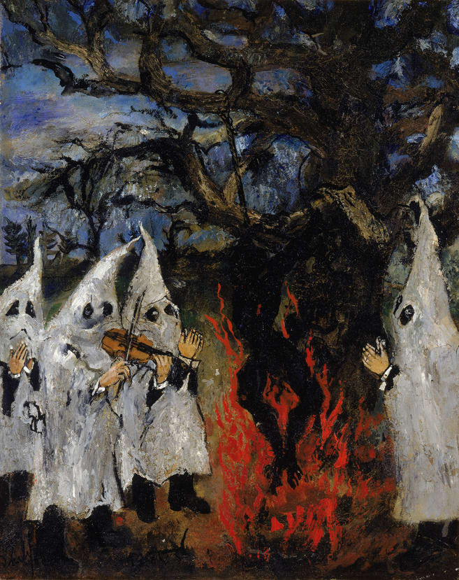 Born Philip Blashki in New York, Philip Evergood studied art in England and France before returning to New York, where he worked briefly under the Ashcan School artist George Luks. In the 1930's, his work became strongly influenced by social themes, such as political oppression and racism. In The Hundredth Psalm, Evergood ironically contrasts the psalm's plea for mercy and justice with the inhumanity of a Ku Klux Klan gathering at a lynching.