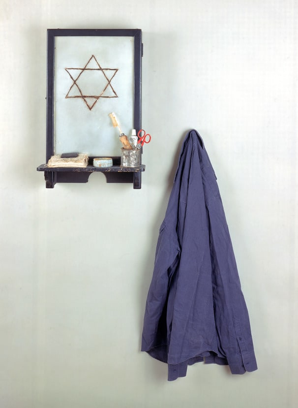 A young woman, Ebrea, walks into the area, approaches the mirror, and removes her clothes. With haunting deliberateness, she repeats her ritual: standing naked in front of the medicine cabinet and mirror, the young woman slowly cuts her hair with a small pair of scissors and, rolling it into threads with glue, attaches the pieces to the mirror. Her actions gradually form a Star of David. The cutting of the hair, the prominent star, and the shirt, reminiscent of a concentration-camp uniform, remind the viewer of the indignities suffered by Jews during the Holocaust. Small Closet with Shirt is the focal point of Ebrea, Fabio Mauri's large installation and his most famous performance work, which was first staged in Venice in 1971 and revived at the 1993 Venice Biennale.