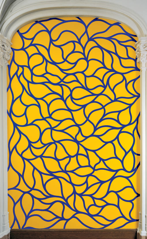In 1999, LeWitt designed these two wall drawings for two bays of the west wall of The Jewish Museum's second-floor galleries, a space that still retains architectural details of the French Gothic-style Warburg mansion, which houses the museum. One wall drawing has a yellow background with purple arabesques. The other exhibits a complementary color scheme of a green background with blue. LeWitt chose the site for this wall drawing, decision befitting his recent interest in installing his abstract, decidedly modernist designs in space with historical references, a radical departure from his earlier, gridlike works that were meant to be installed in the "white cube" spaces of galleries and museums. The idea remained central to LeWitt's late work, as did strategies that refute the primacy of the artist and the notion of permanence in art.