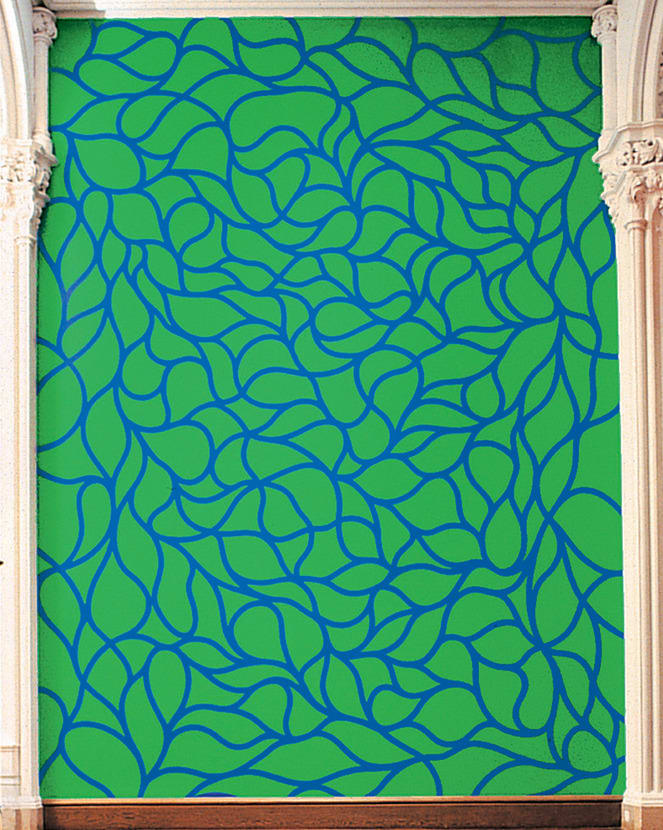 In 1999, LeWitt designed these two wall drawings for two bays of the west wall of The Jewish Museum's second-floor galleries, a space that still retains architectural details of the French Gothic-style Warburg mansion, which houses the museum. One wall drawing has a yellow background with purple arabesques. The other exhibits a complementary color scheme of a green background with blue. LeWitt chose the site for this wall drawing, decision befitting his recent interest in installing his abstract, decidedly modernist designs in space with historical references, a radical departure from his earlier, gridlike works that were meant to be installed in the "white cube" spaces of galleries and museums. The idea remained central to LeWitt's late work, as did strategies that refute the primacy of the artist and the notion of permanence in art.