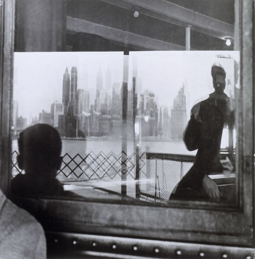 Faurer often used reflections and double exposures to create stunning visual juxtapositions and compositions. In Staten Island Ferry, Faurer captured the ghostly panorama of New York obscured by the window of the ferry. He provided clues that there is a man seated on a bench in front of the window by showing a segment of a suited shoulder and a silhouette of a head. We can only assume that the figure on the right is the photographer, but who is the man that his shadow makes visible? And can he see the majestic cityscape that the photographer is showing us? Without seeing their faces, we perceive the men as entrenched in the skyline before them and thoroughly isolated from each other.