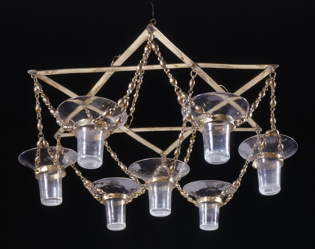 This lamp belonged to Shabdai (Sattu) Koder (1907–1994), leader for five decades of the Jewish community of Kochi, India, and warden of the Paradesi Synagogue, the only active synagogue there today. The Koder family was probably from Iraq and arrived in Kochi via Burma (now Myanmar) in the early nineteenth century. Known as a chattakam vilakku, this type of hanging lamp with seven oil cups has been used by Jews in Cochin, at the southwest tip of India, since at least the late nineteenth century. The Star of David expresses an emergent Zionist sentiment. Lamps in this star form are also characteristic of the Bene Israel community around Mumbai, farther north on the west coast of India.