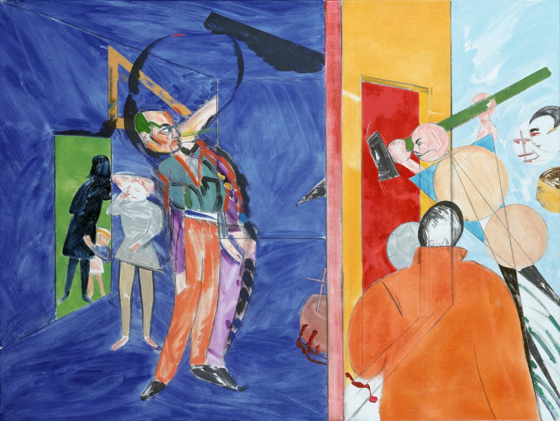 Eclipse of God continues the artist's obsession with historical antisemitic imagery that he began years earlier with the impressive and monumental painting The Jewish School (Drawing a Golem), of 1980. Eclipse of God also connects with his practice of reinterpreting Old Masters painters in contemporary artistic vocabulary. While the earlier work draws its racist imagery from a nineteenth-century popular print, the source Eclipse of God deploys is a predella panel from Paolo Uccello's Renaissance altarpiece Miracle of the Profaned Host (1467-68), commissioned for a church in Urbino. Uccello's original shows Christians breaking down the door to a Jewish family's home to rescue a host (a Eucharist wafer or bread) that had allegedly been purchased by the Jews, thrown into a fire, and begun to bleed. The 'guilty" Jewish merchant and his family were ultimately burned at the stake for their alleged crime against Christianity. Strong religious and political motivations underlie Uccello's imagery, part of an anti-usury campaign that sought to replace Christian dependence on Jewish moneylenders with a new Catholic agency. Thus it portrayed Jews as heretical and faithless.