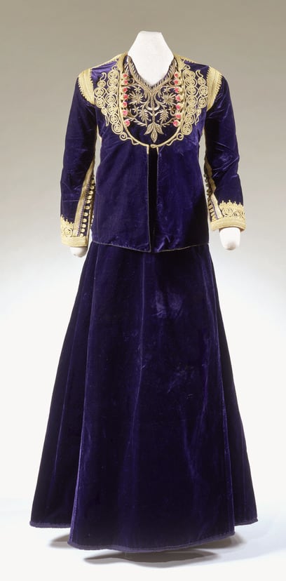 - Dress: Velvet: embroidered with metallic thread; sequins Jacket: Velvet: embroidered with metallic thread and rope; cotton