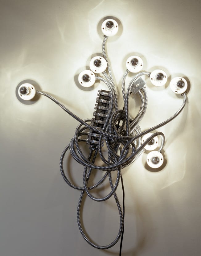 McCaslin's signature vocabulary of industrial materials-lightbulbs, switches, and metal electrical conduit-is metaphorically relevant to the holiday. The artist sees industrial electrical hardware as a sublime material that lurks behind our walls, as ubiquitous as it is hidden, connecting us physically, culturally, and spiritually. Seeing the beauty of these industrial forms, the artist literally brings this infrastructure out of hiding "into the light," a most appropriate expression for Hanukkah, the Festival of Lights.