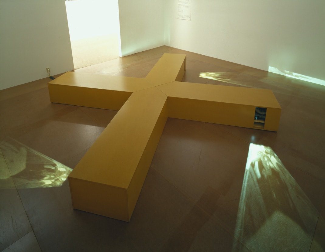 Kuball's crosslike shape is made of inexpensive pressed wood, unpainted and unadorned. Each of the four ends of the cross is pierced with rectangular openings, through which 35-millimeter slides are projected onto the floor. Creating ghostlike, fan-shaped forms, these splayed images are stills from German films of the 1920s and 1930s. When lit, the stills transform the pressed-wood cross into a swastika; the durable industrial sculpture becomes an environment that performs electrically. These still photographs visually re-create Siegfried Kracauer's famous 1947 psychosocial history of German cinema "From Caligari to Hitler." According to Kracauer, the films made between the end of World War I and the election of Hitler set the stage for Nazism. Kracauer, a German-Jewish refugee historian, saw the aspirations and fears, the psychological frailties and political struggles of the German people, encoded in a wide range of German films. For example, he claimed that movies like Paul Wegener's "Student of Prague" demonstrated the insecurities of the foundations of self and that Robert Wiene's "The Cabinet of Dr. Caligari glorified authority connected with madness. According to Kracauer, such manifestations of the German psyche would make the average German easily susceptible by Nazi propaganda, losing the ability to make sound moral judgments. In Kracauer's observations, many productions showed German traits of chauvinism, Romanticism, nationalism, and, ultimately, preference for tyranny over chaos. Thomas Elsaesser has thoughtfully outlined the pitfalls of Kracauer's postwar theoretical position: "he fill[s] gaps, smooth[es] out the narrative logic, invert[s] the causal chains, level[s] off intensities…and den[ies] ambiguities." Elsaesser shows how, according to a large corpus of feminist critiques, Kracauer's history could be easily be deconstructed as "phallocentric versions of politics and history."