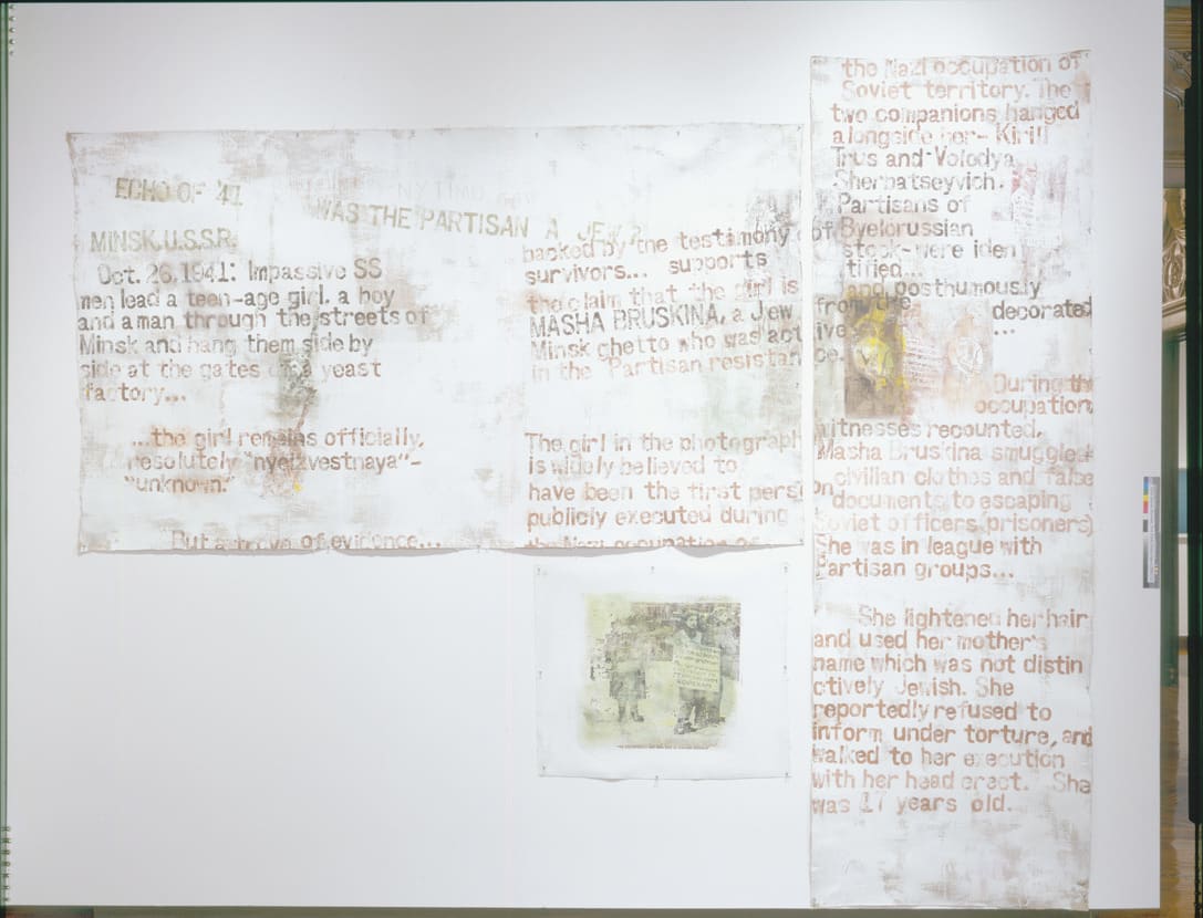 Enticing the viewer to decipher the words and digest the images taken from many decades and sources simultaneously, Spero intersperses and overlaps image and text from Masha Bruskina's story. In the background, she prints images of Bruskina's march through the streets to her death and of her execution. The layers of text begin with a newspaper from October 26, 1941, describing the hanging of an anonymous girl by the Gestapo and seamlessly flow into a segment of an article from twenty-five years later, revealing the discovery of this victim's Jewish identity. Spero adds a faint red scrawl to the top of the canvas that refers to Bill Keller, a New York Times reporter who covered the Soviet Union during the cold war, alluding to the way we process the many layers of information delivered by the media.