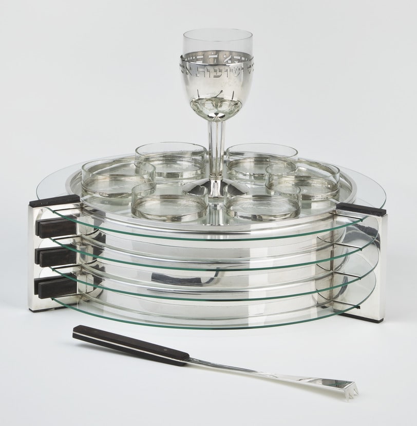 Ludwig Wolpert is the first metalworker to apply these progressive principles to the fabrication of Jewish ceremonial art. His Passover service, a copy after a lost original designed in 1930, may be his masterpiece. Its conception and execution aptly express the ideas generated by the Bauhaus School, first during its years at Weimar and then in Dessau. Wolpert gleaned many of these concepts from his Bauhaus-trained teacher Leo Horowitz and also became aware of burgeoning Bauhaus design through publications and colleagues.