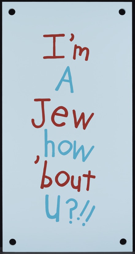Multimedia artist Cary Leibowitz was one of the few men included by curator Marcia Tucker in the landmark exhibition Bad Girls, which introduced a new generation of humorous and edgy feminist art, at the New Museum of Contemporary Art in 1994. Leibowitz remarked that men making art about gender try to be good boys, not bad girls, often making fun of masculinity, while avoiding sexist imagery. The cheerfully scripted texts in Leibowitz's paintings walk the edge of political correctness. I'm A Jew how 'bout U?!! shares with contemporary feminist art a playfulness with language and self-representation.