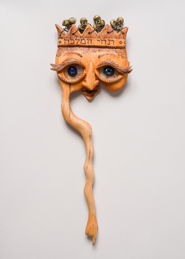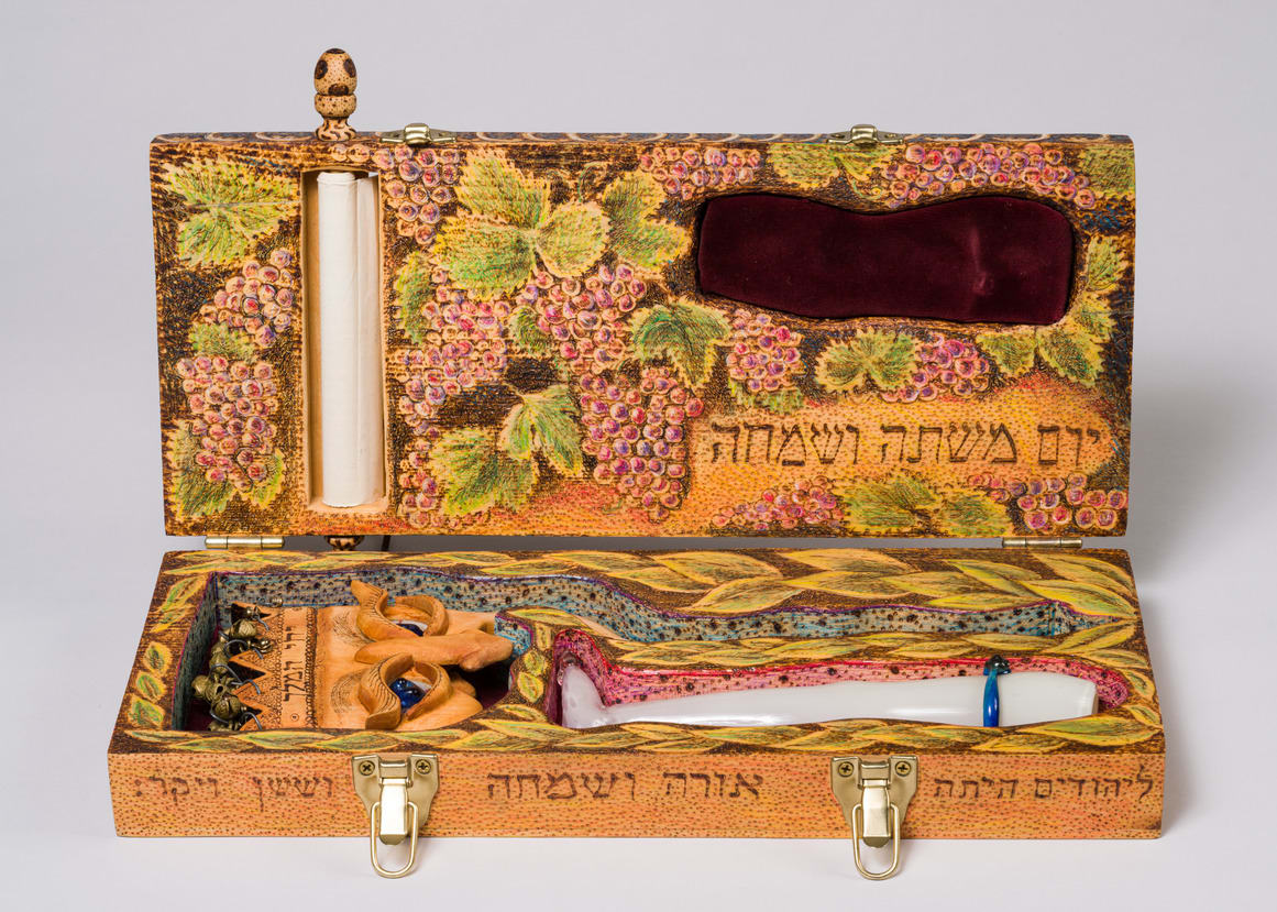 On Purim, it is traditional to drink and dress in costume to celebrate the salvation of the Persian Jews from the king's wicked advisor, Haman. The objects in this kit include pieces that are used in this celebration and acknowledge the central importance of women in the Purim story. The double-sided mask features King Ahasuerus on one side and the story's heroine, Queen Esther, on the other. The flask, shaped like a woman's leg and representing Vashti, King Ahasuerus' first wife, appears to be "kicking" her husband in the face.