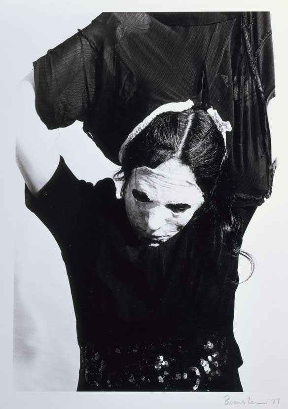 Unlike some feminist performance art based on traditional burlesque, Public Document did not end with a “money shot” of Bornstein’s naked body. Instead, the artist’s final reveal was a heavy black wetsuit that masked her body in an androgynous rubber skin. In the tight close-ups of these photographs, Bornstein’s striptease is deliberately clumsy and unalluring. The ambiguous images suggest the impossibility of full disclosure.