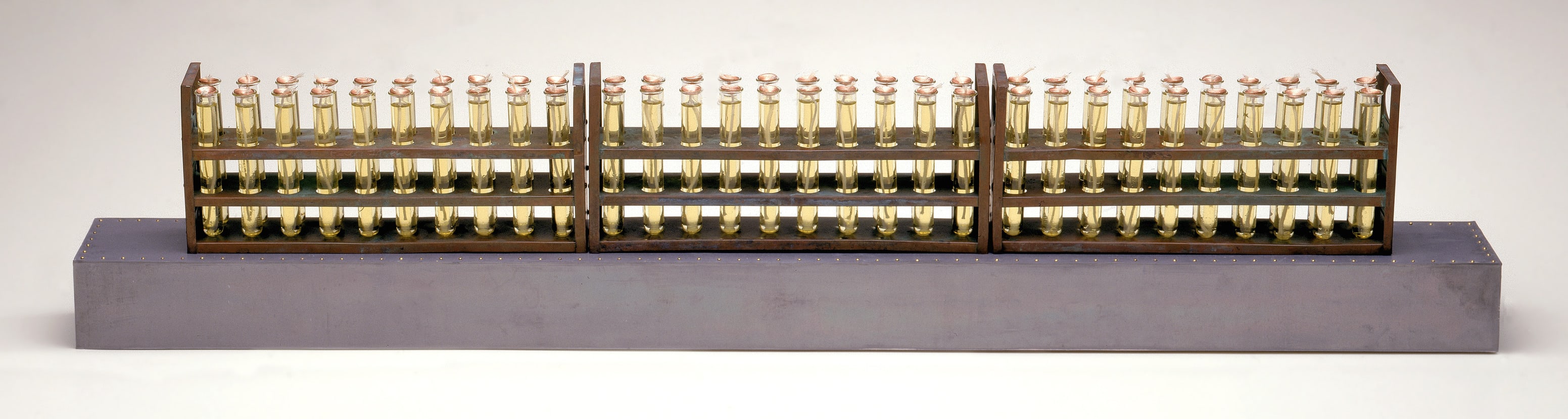 In his use of test tubes for oil containers, Salo Rawet associates the ancient miracle of Hanukkah with the search for a cure for AIDS, cancer, and other plagues of our time. The artist proposes here an alternative version of lighting the Hanukkah lamp, extending beyond the traditional eight days of the holiday to symbolize continuous cycles of the sun and moon. In this new interpretation, the lamp becomes and embodiment of hope and an expression of "human attempts to intervene and support the divine process of exuding miracles in our daily life."