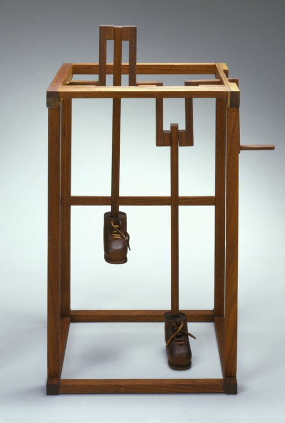 The contemporary artist András Böröcz has created a series of wood sculptures related to the festival of Purim. He became fascinated with the grogger, a hand-held noisemaker used in the synagogue during the reading of the Book of Esther to blot out the name of the villain, Haman. In some Jewish communities, people write Haman’s name on the soles of their shoes in order to stamp it out whenever it is mentioned. Böröcz’s mechanical shoe-stomping apparatus makes the requisite noise when the handle is cranked.