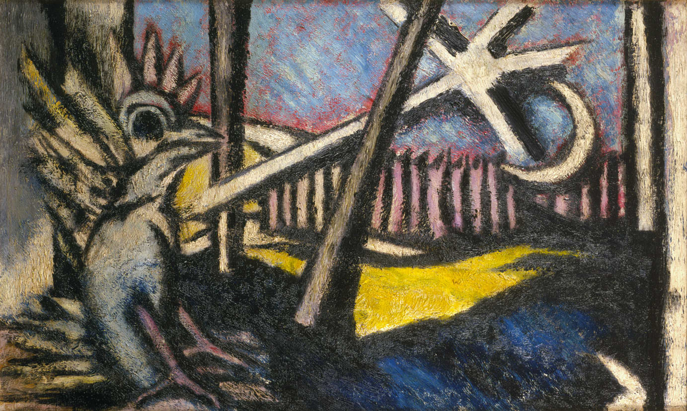 Ben-Zion's fascination with ancient visual and literary traditions can be seen in Strange Bird. The crescent moon and the star, recurring motifs in his nocturnal paintings, were inspired by ancient Mesopotamian imagery, such as a Sumerian seal with an incised star that the artist carried in his pocket. In his Hebrew poetry, Ben-Zion wrote about the mysterious and magical quality of the night with its moon, stars, strange birds, and beasts-the world of dreams and imagination.