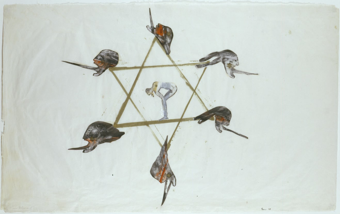 Painted at the height of the Vietnam War, Nancy Spero’s work invokes the Holocaust to indict America’s brutal neocolonial militarism. Her Star of David has six screaming, spike-tongued death heads at its points, each bearing a yellow star—a reference to the badges Jews were forced to wear by the Nazis. Each is labeled with an early year of Hitler’s regime, when the first extermination camps were built. The heads can also be read as helicopters, one of Spero’s recurrent symbols of modern industrialized warfare. The helicopter is “a primeval (prime-evil) bird or bug wreaking destruction. I imagined that Vietnamese peasants saw it as a giant monster. I viewed the helicopter as the symbol of [the Vietnam] War.” At the center of the Star of David is a bent, howling human figure, an anguished expression of horror at the mechanized violence of contemporary war.
