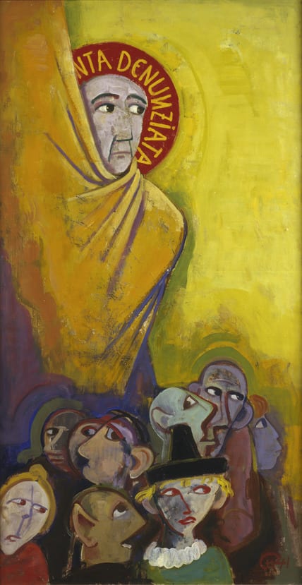 A vehement anti-Nazi protest, this work is tied to the tragic events in Karl Hofer's life. In 1941, Mathilde Hofer (neé Scheinberger), the artist's estranged wife, was denounced as a Jew by Gestapo informants (Denunziaten) and sent to her death at Auschwitz. The artist then declared; "When they are finished with the Jews, they will start with the artists, and with all of those who cannot defend themselves." The partly concealed, haloed figure, is likely a self-portrait of the artist as a future victim surrounded by accusers who may fear they will be the next victims themselves.