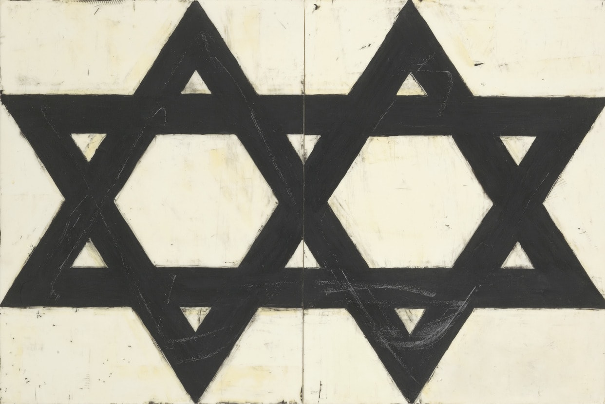 The abstract painter David Ortins transforms seemingly plain compositions into nuanced, contemplative objects. Here, two interlaced Stars of David appear simple and benign, yet their placement, split over two panels, assumes a certain confrontational aspect, bursting out of the picture frame. The stars are smoothly painted, but the delicate, translucent beeswax surface is full of subtle imperfections and barely visible scars. “I am attracted to simple geometric forms,” the artist has said. “These can be universally recognizable signs or symbols at any point throughout history. Some are obscure (a bar or rectangle) while others are more personal (the Star of David).