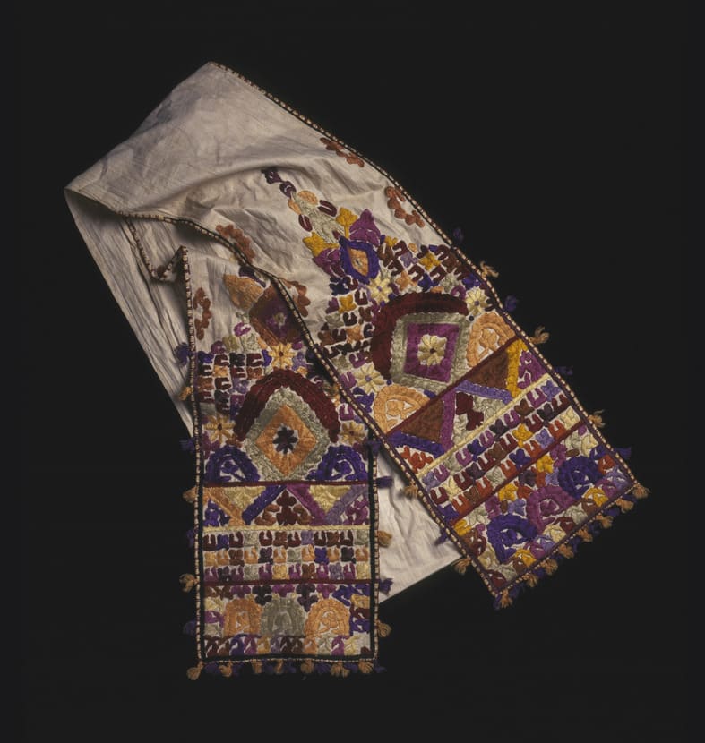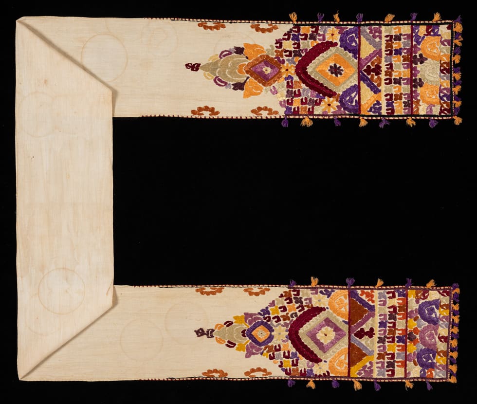 Although this embroidery is typical of Rabat in its density, the combination of bright colors and its motifs: stylized bell shapes and zigzag borders, its use is unique. Its Hebrew inscription suggests it was used as a Torah binder. The major motif of the embroidery is the repetition of the letters aleph and tof, the first and last letters of the Hebrew alphabet, which may be a mnemonic device for the phrase "the light of the Torah."