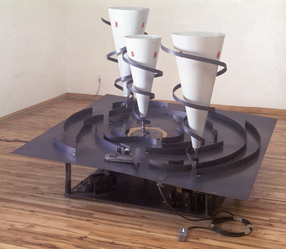 Alice Aycock conveys a child's awe in seeing the multiple lights of Hanukkah. She adapts another feature of the holiday, the dreidel - a small, inscribed top that children play with during this festival - as her principal element. Transposing her interest in science and games of chance into a giant-sized kinetic version of the dreidel, she electrifies the top and endows it with a sense of power.