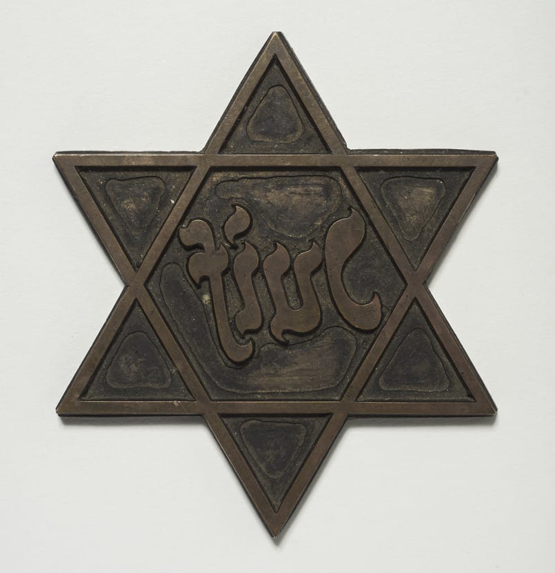 Until the Holocaust, the six-pointed star had only positive connotations in Jewish tradition. It was used as a symbol of communal identity, a protective device in amulets, or a Zionist emblem. After the German occupation of Poland in 1939, the Nazis forced Jews to wear a yellow star as an identifying badge, often inscribed with the word “Jew.” The lettering, seen here in French, was meant to resemble Hebrew. This measure deliberately turned a symbol of Jewish pride into an emblem of discrimination that singled out Jews, restricted their movements, and marked them as prey. Concealing the badge was an offense punishable by deportation to a concentration camp.