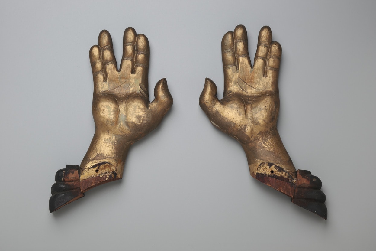 These hands repeat a gesture made by the ancient priests and their descendants to bless the congregation. They were made to decorate a Torah ark in the Tifereth Israel synagogue in Boston and were originally embellished with gold leaf. When they were later retouched, gold paint was used, suggesting a shift in the fortunes of either the synagogue or the sculpture itself.