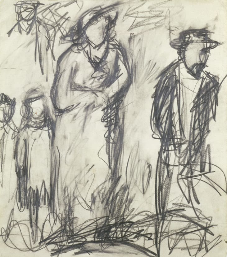 Larry Rivers often included autobiographical references in his work, as in these sketches of mourners at his grandmother's funeral. Loosely based on nineteenth-century French painter Gustave Courbet's Burial at Ornans, in which the grave itself is at the front of the composition, the drawings transform the art-historical reference with a highly personal rumination on family and death.