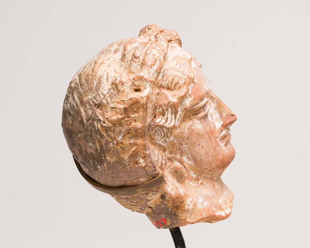 This head, although probably of Roman Period date, is imitative of earlier Hellenistic types. The figure is possibly wearing an ivy wreath, which connected with the Greek god Dionysus, whose cult becomes extremely popular in Late Hellenistic and Roman times in the eastern Mediterranean, even reaching as far as Iran. The style of hair and the treatment of the eyes are perhaps more characteristic of Roman work.