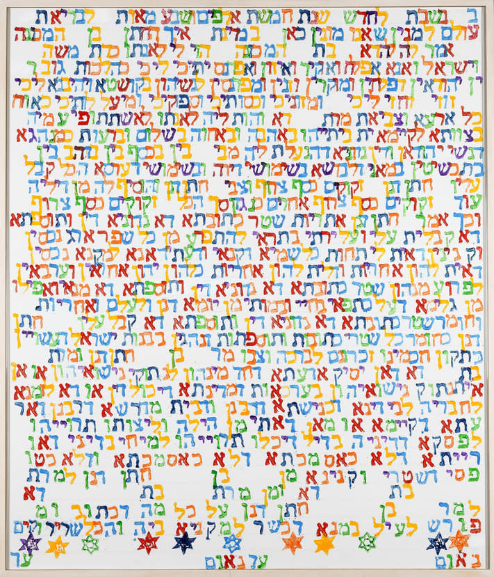 - Acrylic and vinyl paint on canvas; relief print letters